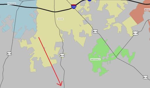 Large 1.7 acre corner lot with over 10,000 cars per day. Across Southern High School Rd from a Dollar General. Great Investment opportunity for a high growth area. Very close to city limits and amenities. Outside of the Graham City limits and ETJ where there is no Countywide zoning. Across highway 87 from a new Exxon station. Many possibilities. Retail, Self Storage, Car Wash, Laydown yard etc. Property does include a house that could be rented to generate income if your project was planned for the future. Public Sewer in vicinity. Alamance County GIS map has not been updated since plat was recorded.