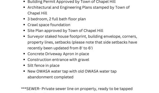 Shovel-Ready Investor Gem - 1.3 Miles to UNC Campus! Skip the red tape and start building immediately on this prime lot in the heart of Chapel Hill. Located just 1.3 miles from UNC, this property is perfectly positioned for high-demand student housing or a lucrative rental. All the heavy lifting is done: approx $20,000+ in pre-construction value is included, featuring town-approved architectural plans for a 3BR/2BA home, approved permits, and a site already surveyed and prepped with a driveway apron, gravel entrance, and OWASA water taps. With a walking path to the bus stop at the end of the street, your future tenants are minutes from class. This is the definition of a ''plug-and-play'' development--just bring your contractor and start framing! Please see Docs section for detailed pre-construction improvements and contact list agent for all questions on approved house plans. Property in Pine Knolls Conservation District.