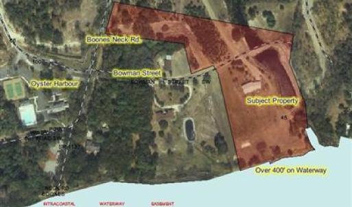 9.03 Acres, with over 400' on ICW and 136' on Boone's Neck Rd, located across street from Oyster Harbour. Zoned MR-3200. Owners licensed NC Real Estate brokers and principals of listing company.