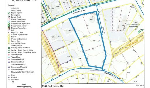Corner lot across from Papa Johns with 215 ft. frontage on Old Forest Road, plus 445 ft. frontage on West Street, plus 100 ft. on Confederate Ave. Water and Sewer available. Zoned B-3 & R-3. Excellent site for strip center, restaurant, C-store or professional offices. Existing house is currently rented as residential, but could be used for office.